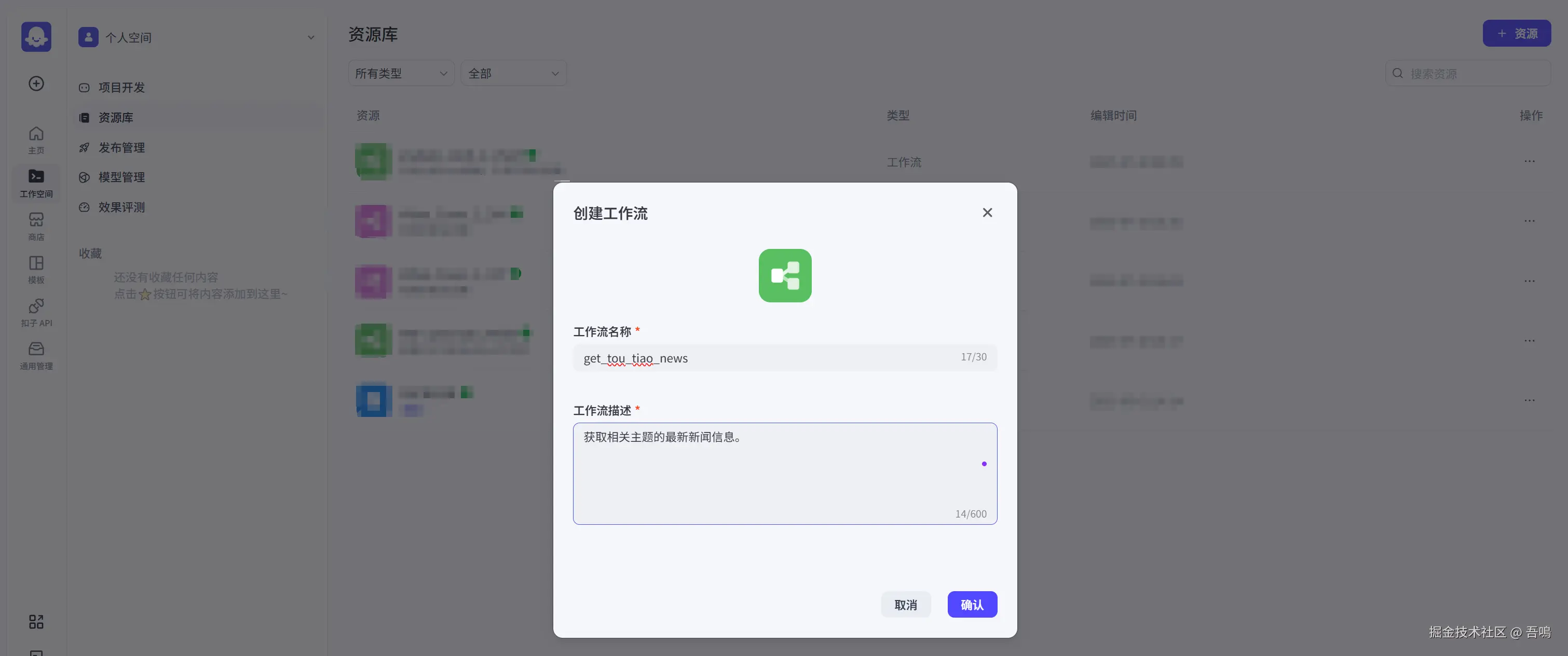 - 输入工作流名称、工作流描述,点击确认