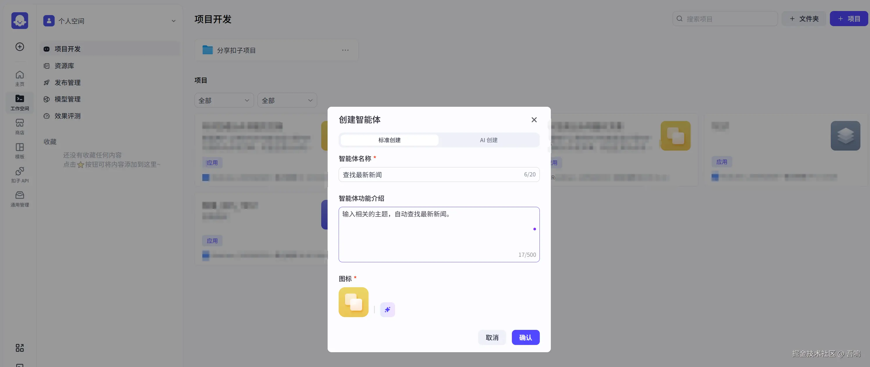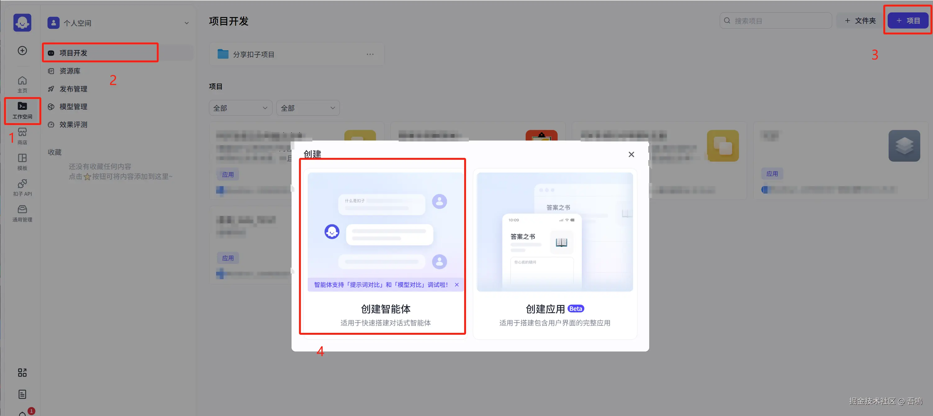 - 右上角项目,+项目 -> 创建智能体