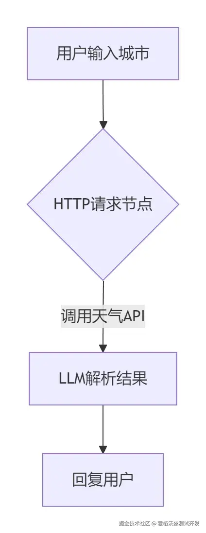 System Prompt: “请用口语化描述今日天气,包含温度/降水/风力” 输入变量: {{API返回的JSON数据}} -