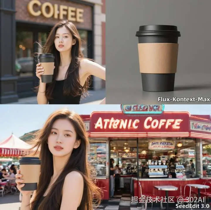 简评:SeedEdit 整体最佳。从人物/咖啡杯两个主体的一致性,人物表情动作的自然感,生成背景为美式复古风格的咖啡馆三个要素评判,SeedEdit 的出图美感最强。