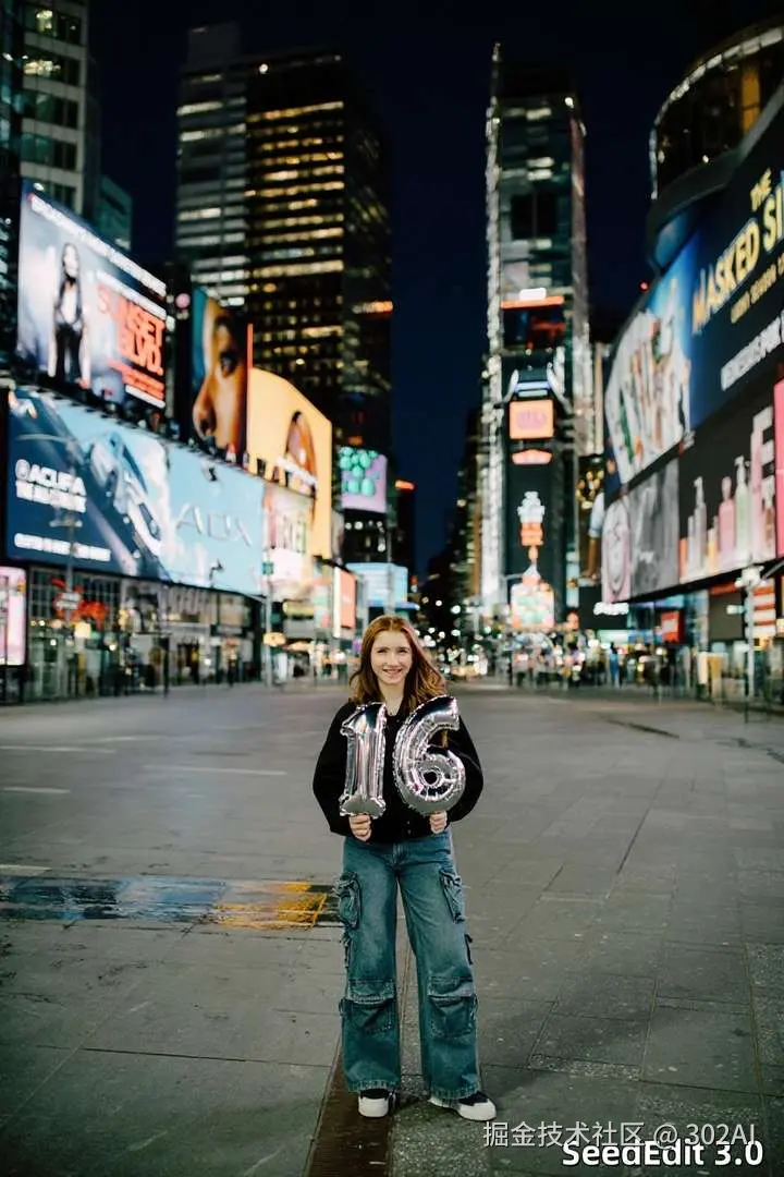 提示词:Keep the main subject in the image unchanged. Remove any passersby or unrelated people from the background. Transform the environment from daytime to nighttime, ensuring that buildings, billboards, and lighting in the background are realistically adjusted to reflect a night scene. Pay special attention to how light and shadows on buildings and signs change to match the nighttime setting. (保持画面主体不变。移除背景中的路人及无关人员。将环境从白天变为夜晚,并真实地调整背景中建筑、广告牌和灯光,以匹配夜景。请特别注意建筑和招牌上的光影变化,使其符合夜晚的设定。)