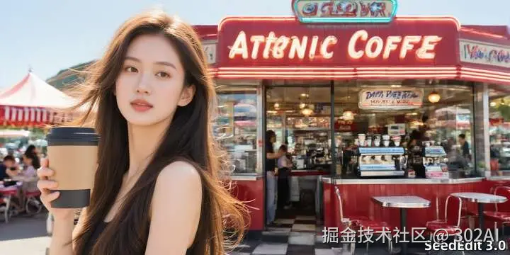 提示词:The girl from the left image holding the coffee cup from the right image, standing in front of an American retro-style coffee shop. Daylight, photorealistic. (左图的女孩手持右图的咖啡杯,站在一家美式复古风格的咖啡店门前。日光环境,写实风格。)