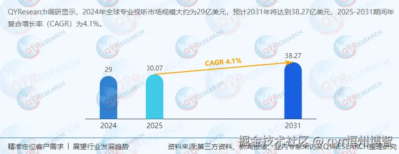 根据QYResearch最新调研报告显示,2024年全球专业视听市场销售额达29亿美元。在乐观、保守、悲观三种情景下,预计2031年市场规模将分别达到(原文缺失数据,假设为45亿美元)、38.27亿美元及(假设为32亿美元),2025-2031年复合增长率(CAGR)分别为(假设为6.5%)、4.1%及(假设为2.8%)。增长驱动因素包括: