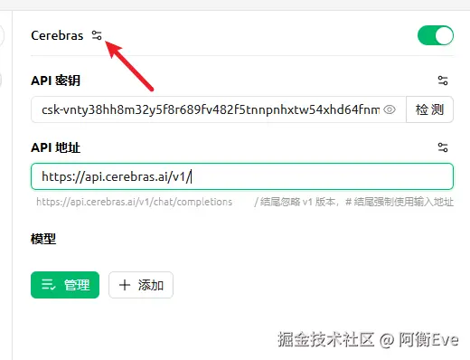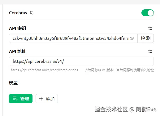 2、填写你在网站上新建或者默认的 API Key(这一步就不用教了吧,在网站上自己找找看) API 地址:api.cerebras.ai/v1/