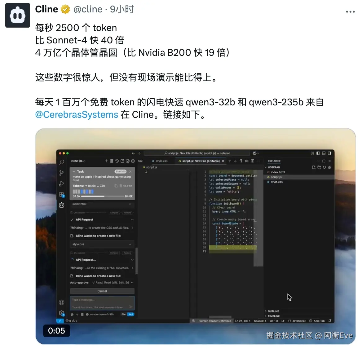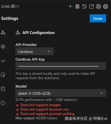 API Provider 选择 Cerebras,配置好你的 API Key,选择合适的大模型,写代码应该就是使用大碗的 235b