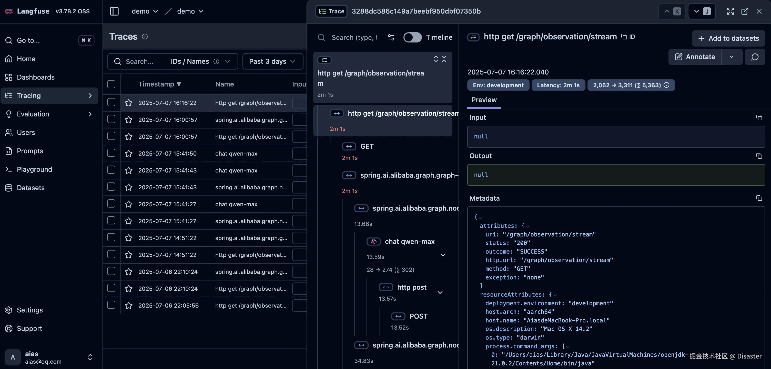 通过Micrometer-OTel桥接器,Graph中每个观测事件被转化为OTLP协议中的Span或Metric数据结构,再通过OTLP/gRPC或OTLP/HTTP协议传输至远端采集器(如Langfuse、Zipkin等)。其中,Observation中记录的输入输出、状态、异常、时间戳等信息会被注入到OTel的Span属性(Attributes)中,确保数据流的可读性与可还原性。