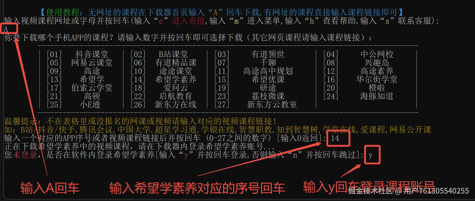 【详细教程】如何下载希望学素养上面已购买的视频课程 用户761305540255 2025-07-24 143 阅读1分钟 前言:很多同学都想知道希望学素养视频课程怎么下载,但是希望学素养上面已购买的视频课程是不提供直接下载方式的,所以下面就教大家如何下载希望学素养上面已购买的视频课程。 一、下载器首页输入A回车,再输入希望学素养对应序号并按回车,提示登录,再输入Y登录对应的希望学素养账号 二、此时会有弹窗让你登录,选择对应登录方式登录希望学素养账号即可 三、登录后会出现已购买的课程列表,找到要下载的课程,输入对应序号并回车 四、然后会提示输入下载选项,直接回车即可,可以批量自动下载视频文件 五、下载好后的文件可在本地路径下的Download目录中找到,可用播放器打开 六、学无止下载器获取地址 www.xuewuzhi.cn/xiwang_down…
