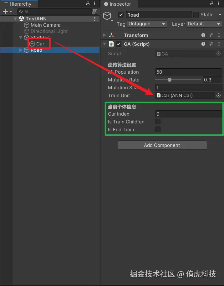 至于绿色框内的,Is End Train用来结束遗传算法的训练,并将最好的结果保存到先前的ScriptObject中。其余只是用来观察小球当前训练情况而已。