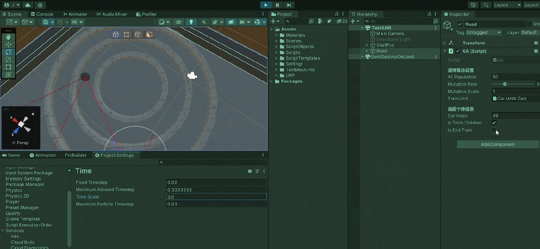 一切就绪后,点击运行即可训练。训练时我们可以调整Project Settings/Time/Time Scale加速训练。