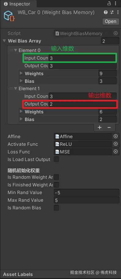 至于中间其它参数的设计要符合神经网络的结构,具体来说就是:每一层的Weights数量要等于InputCount * OutputCount;除了第一层外,其它层的InputCount要等于上一层的OutputCount。(如果你对神经网络有所了解,那就能理解这些。)