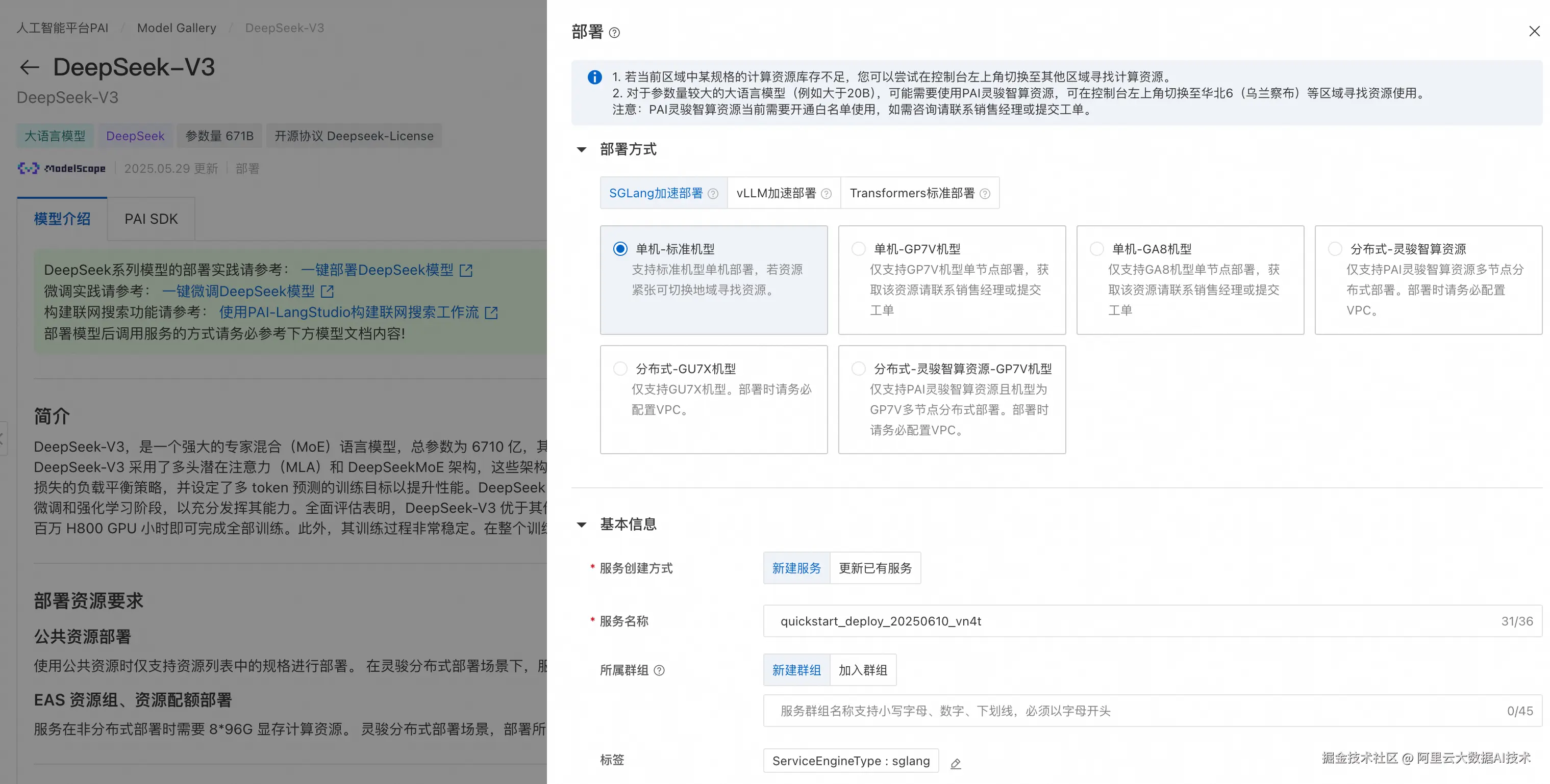 PAI 提供的DeepSeek-V3预置了模型的部署配置信息,可以选择SGLang 部署/vLLM部署/Transformers部署,用户仅需提供推理服务的名称以及部署配置使用的资源信息即可将模型部署到PAI-EAS推理服务平台。