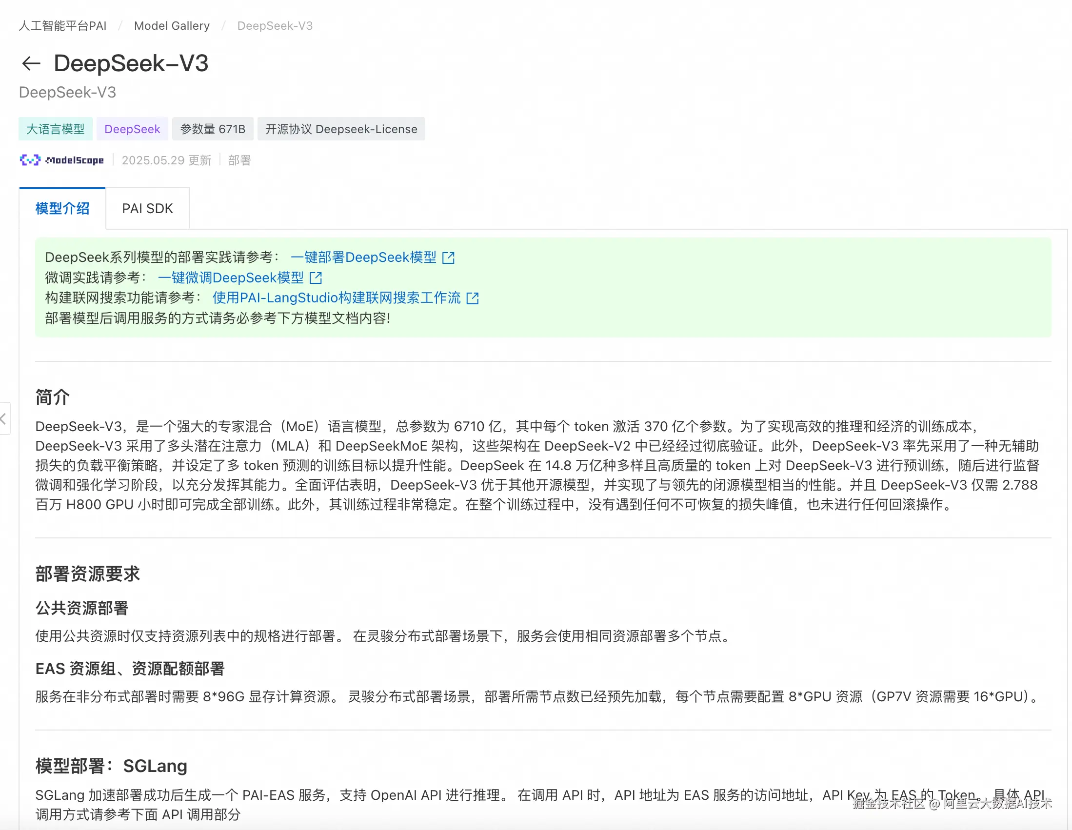在PAI-Model Gallery选择DeepSeek-V3模型或者其他教师大模型,在模型部署区域,系统已默认配置了模型服务信息和资源部署信息,您也可以根据需要进行修改,参数配置完成后单击部署按钮。以DeepSeek-V3为例,其模型卡片如下所示:
