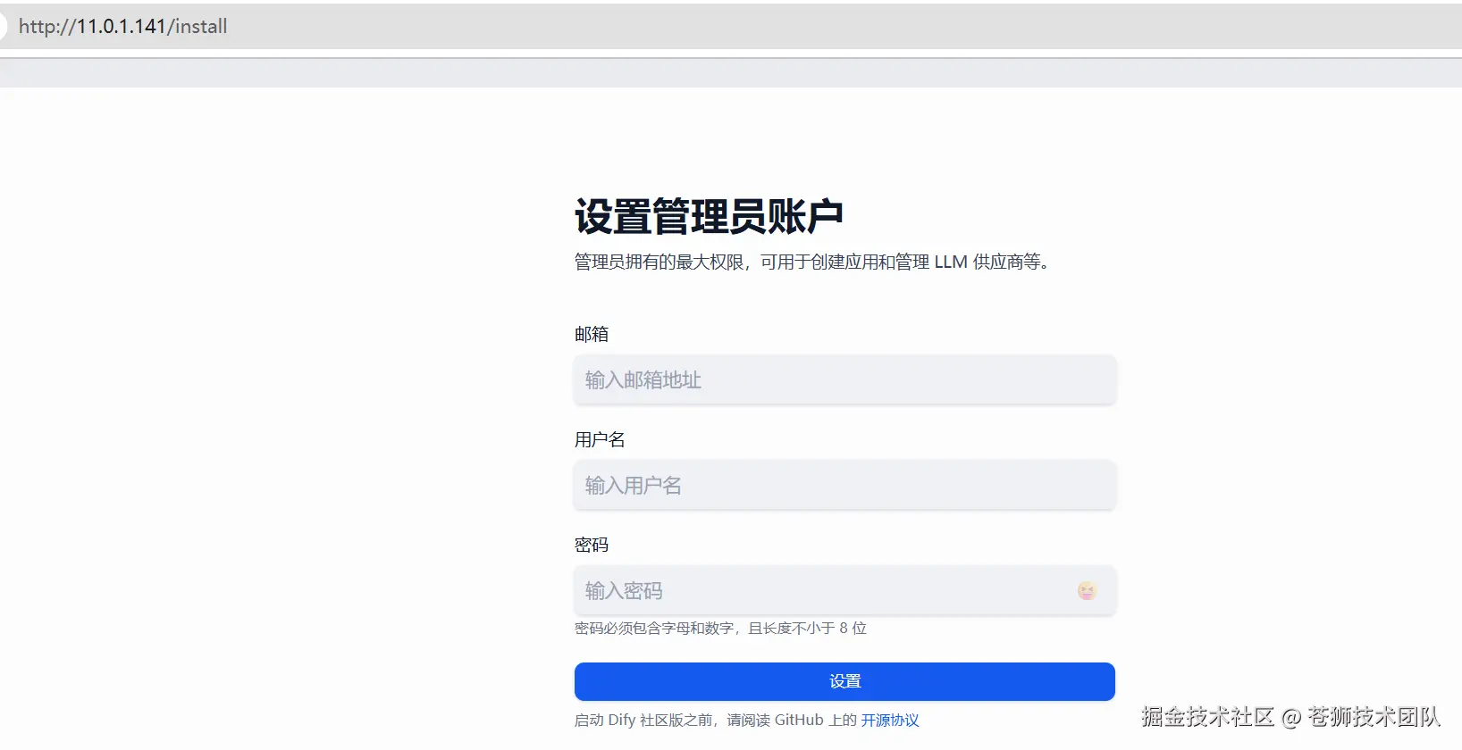 - 部署的IP+端口进行访问,默认为80端口, 如:http://11.0.1.141/install