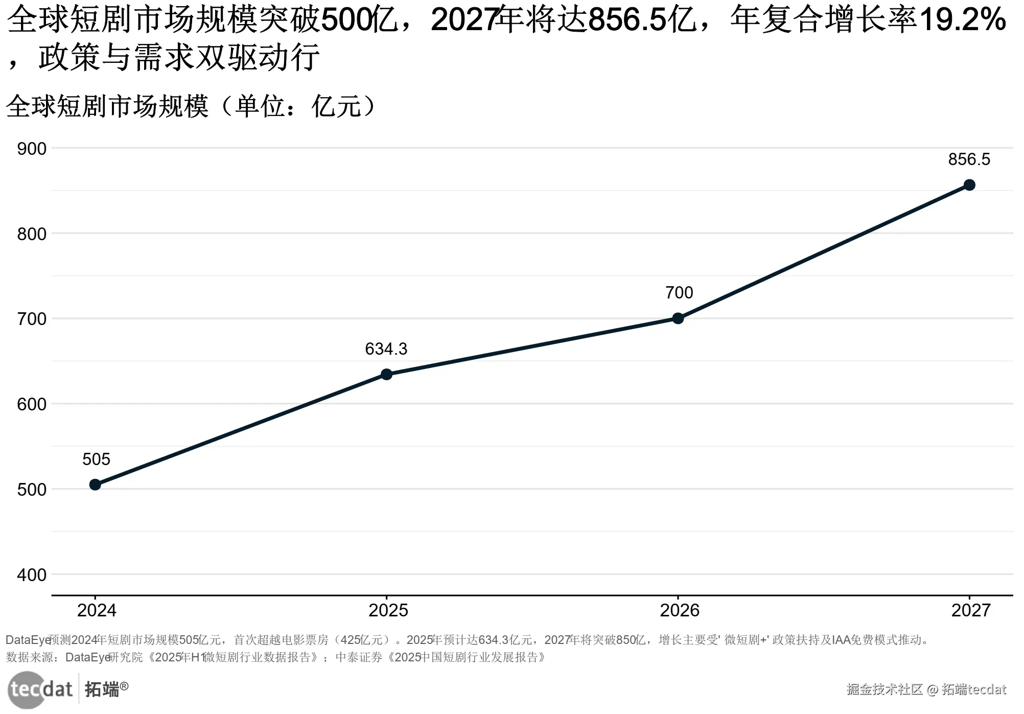 2024年全球短剧市场规模达505亿元,首次超越同期国内电影票房(425亿元),标志着短剧从边缘娱乐形式跻身主流文化产业赛道。从增长曲线看,2025年预计增至634.3亿元,2026年突破700亿元,2027年将达到856.5亿元,年复合增长率稳定在19.2%。