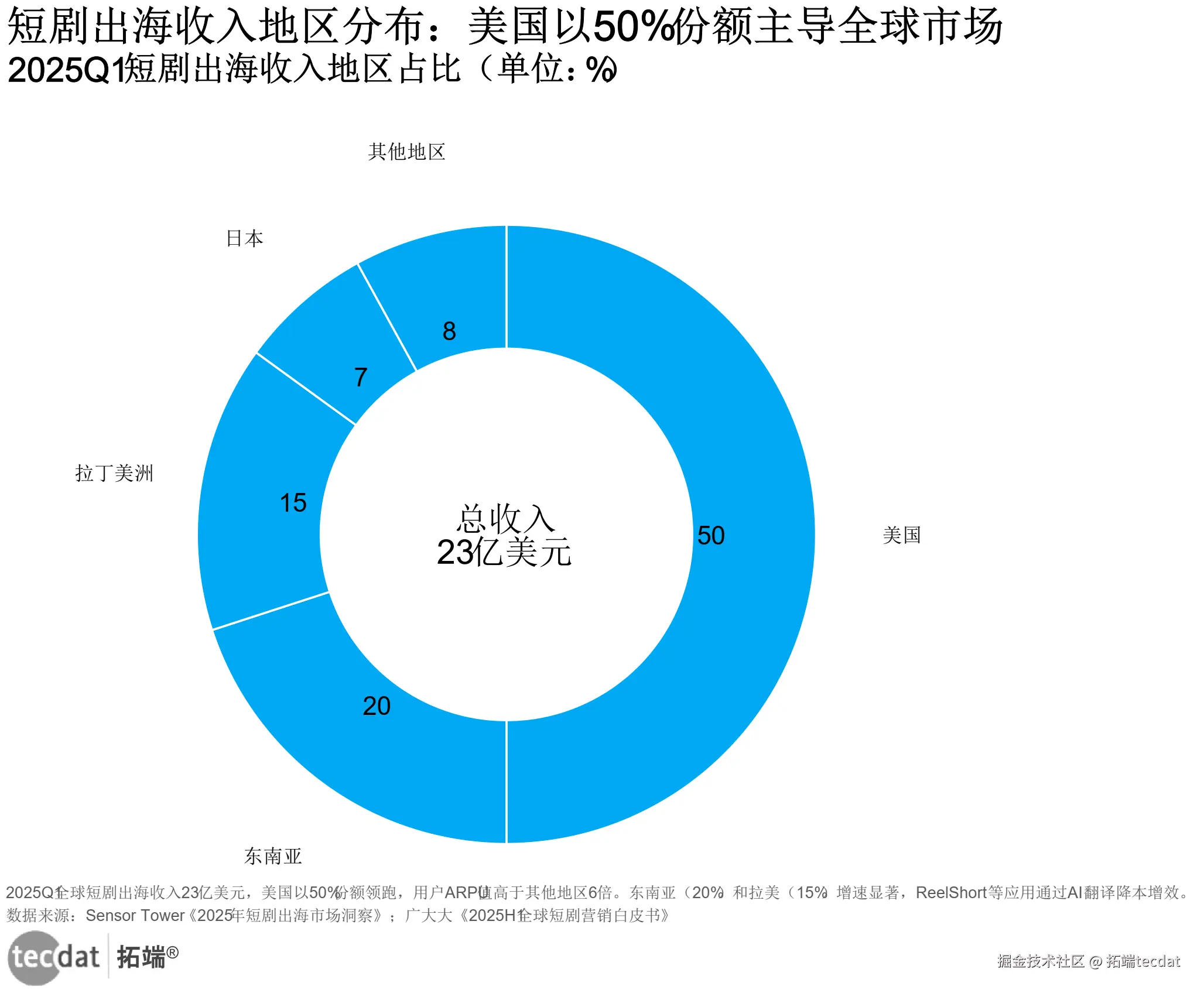 2025年第一季度,全球短剧出海收入达23亿美元,同比增长171%。地域格局呈现“一超多强”:美国以50%的份额稳居第一)