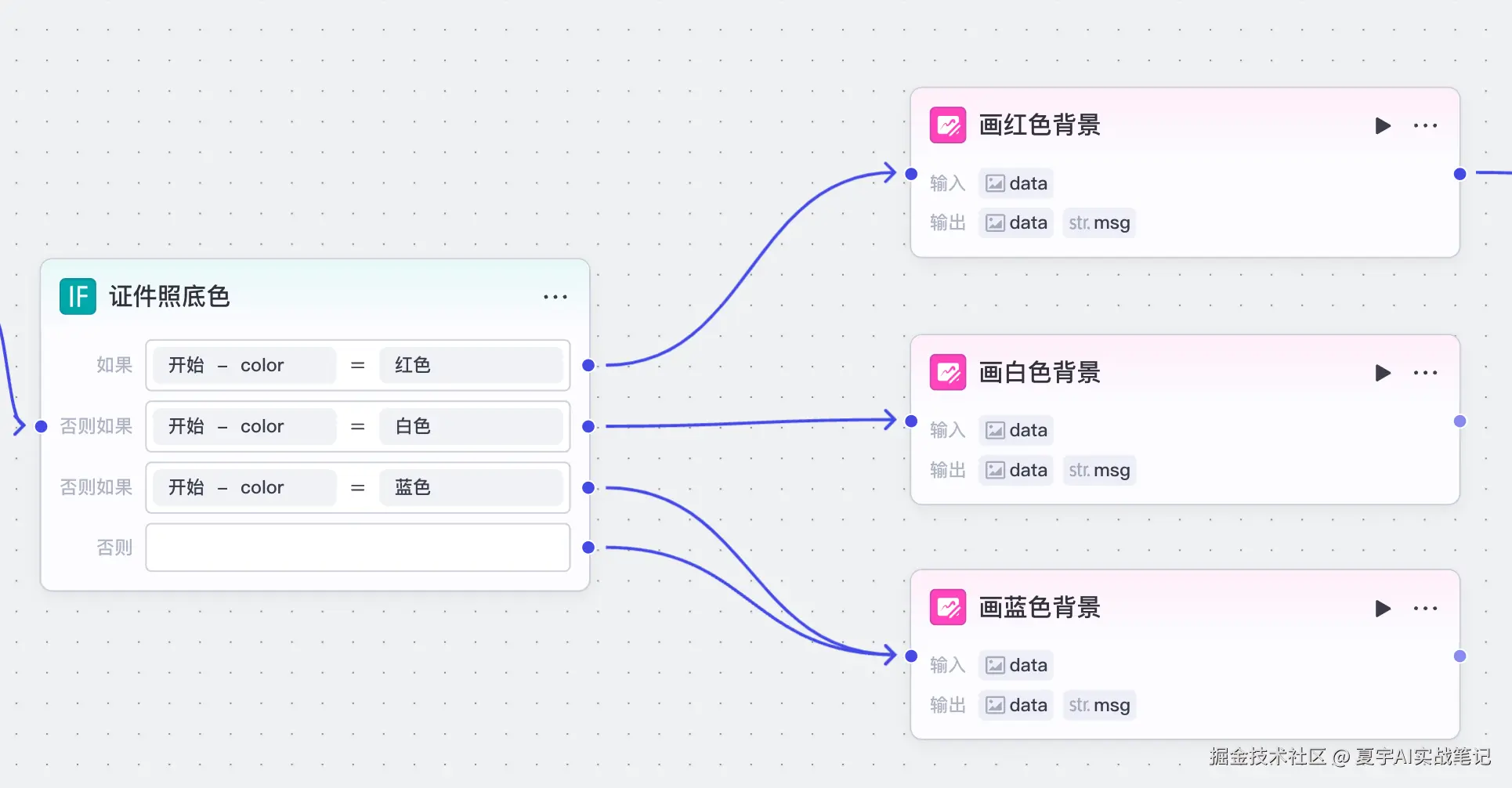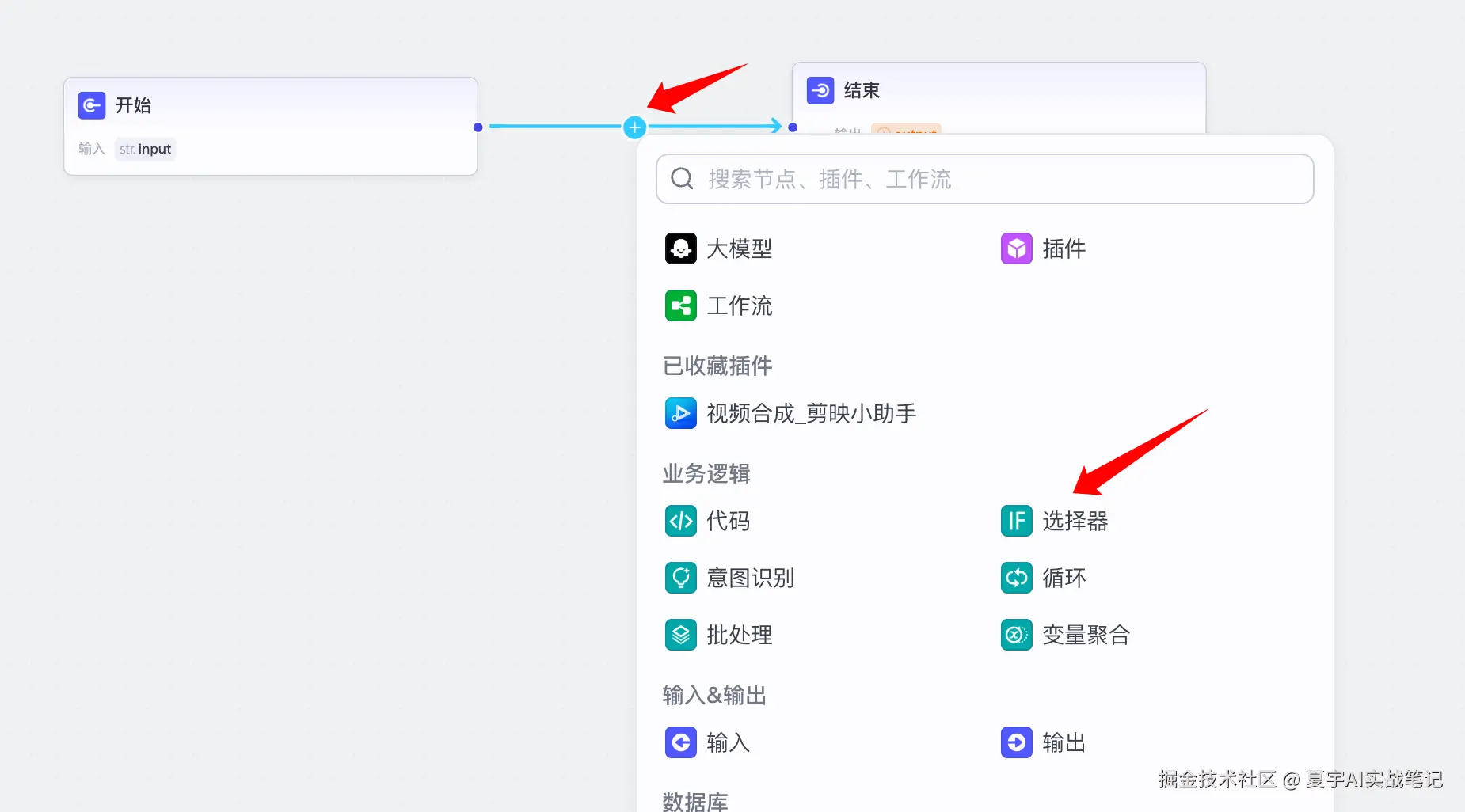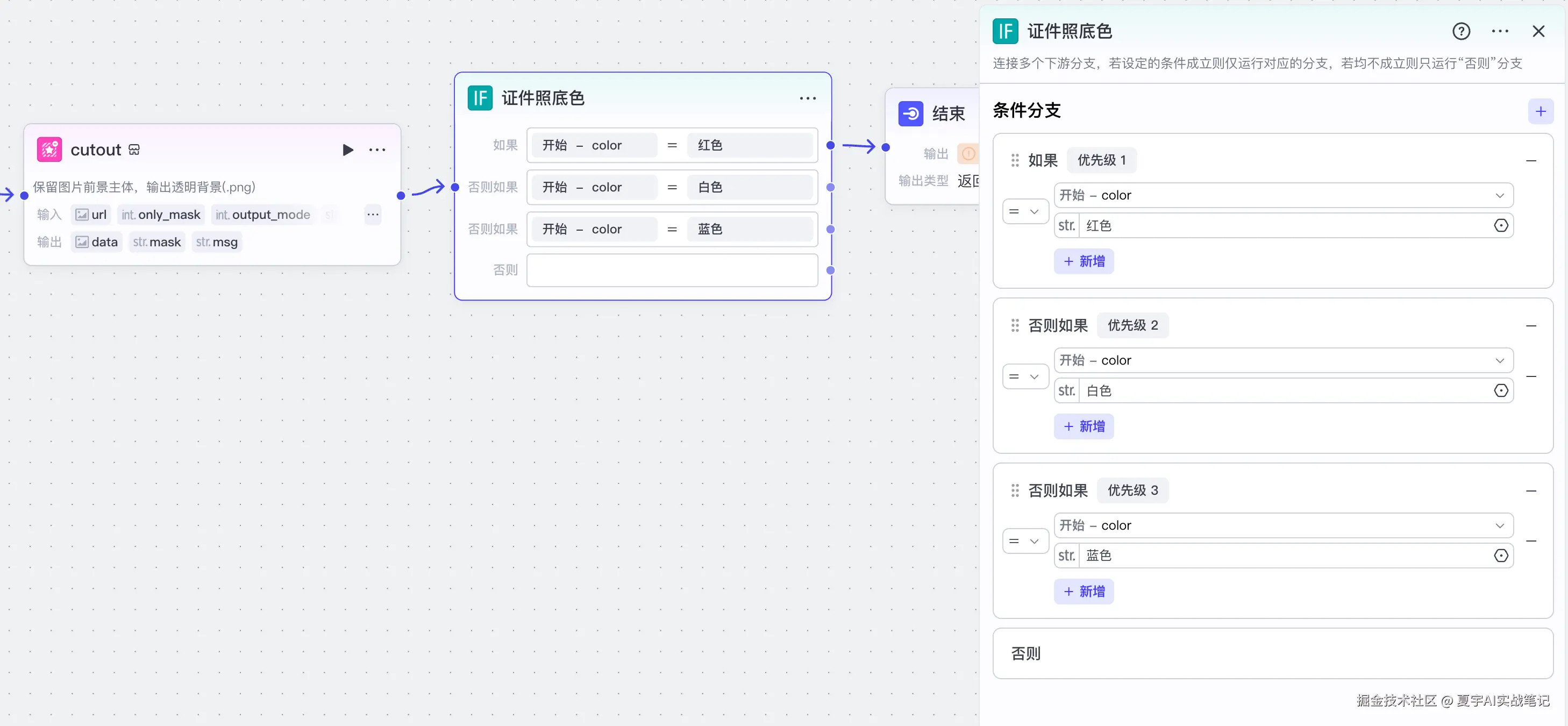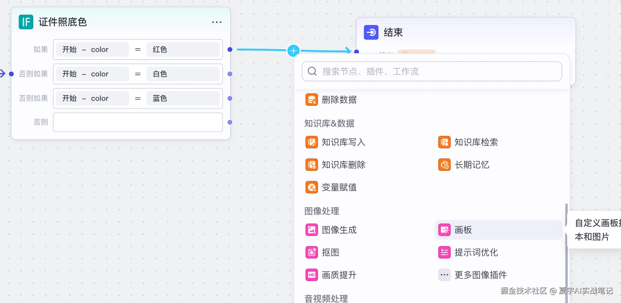 点击开始节点后的「+」号,添加一个选择器,用于判断用户是否正确填写证件照底色。