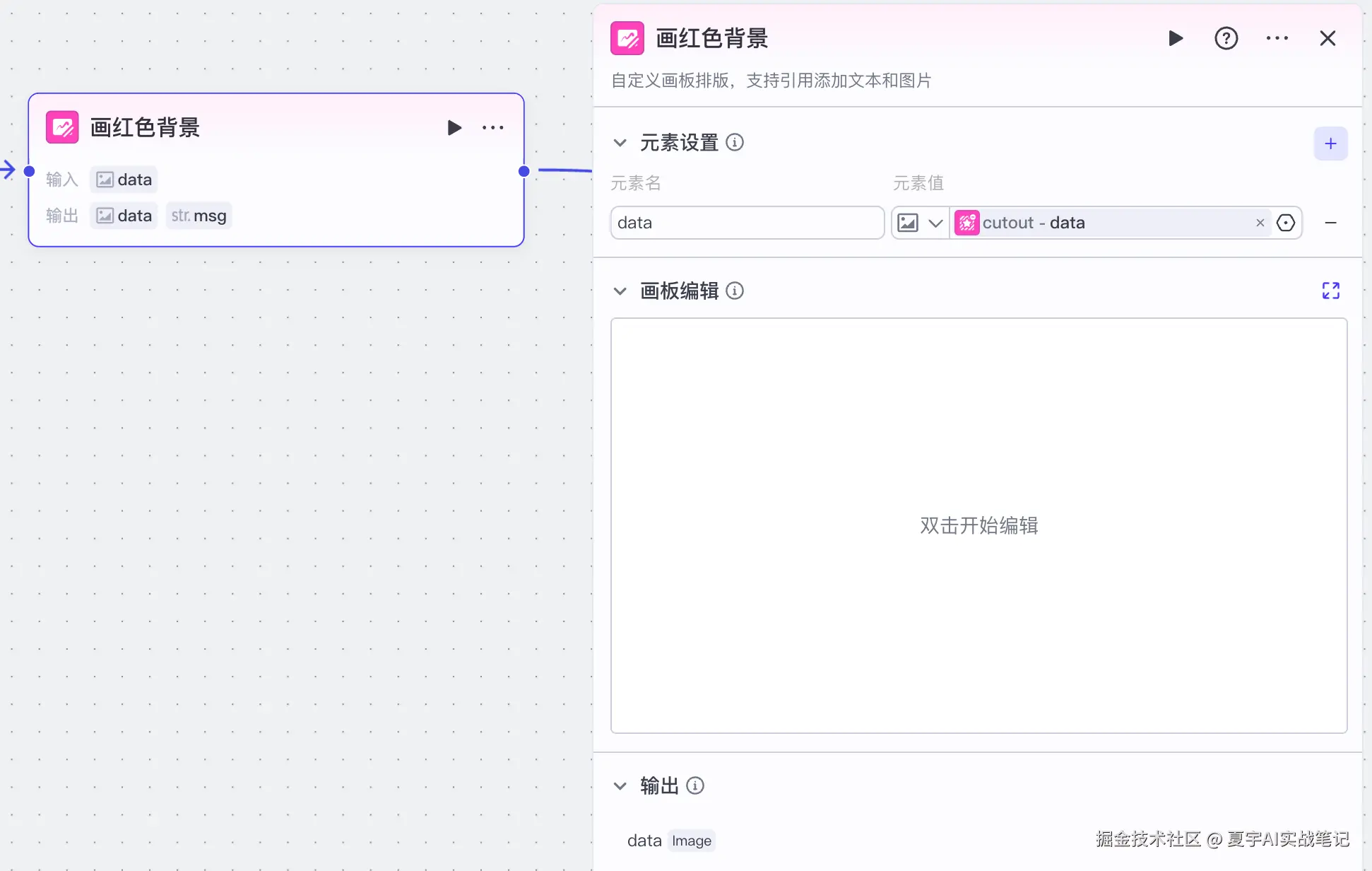 元素设置这里,引用抠图的输出项 data,画板编辑这里双击开始编辑。