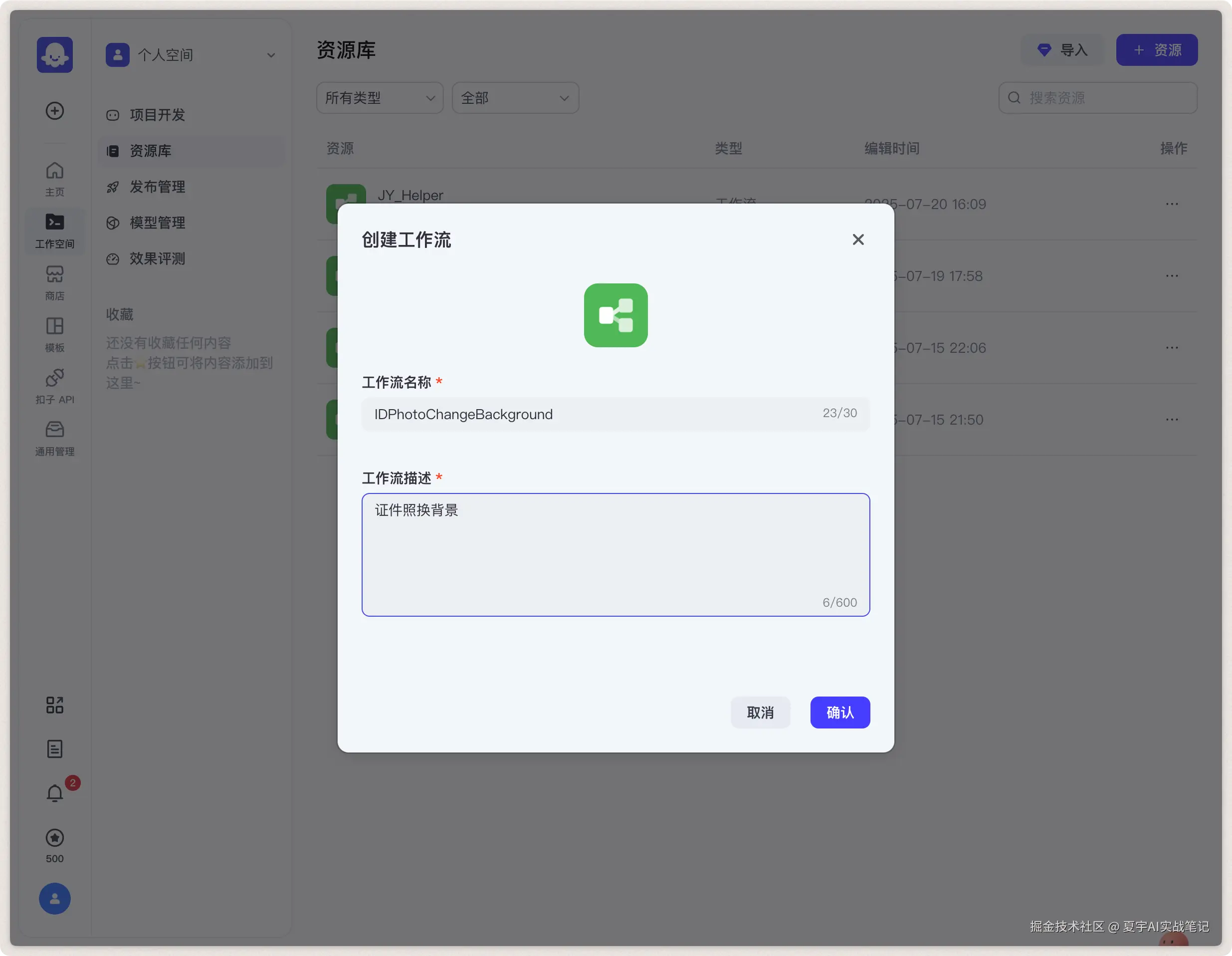 工作流描述:这里填写「证件照换背景」,这个描述是给大模型看的,让大模型理解什么情况下应该调用此工作流。