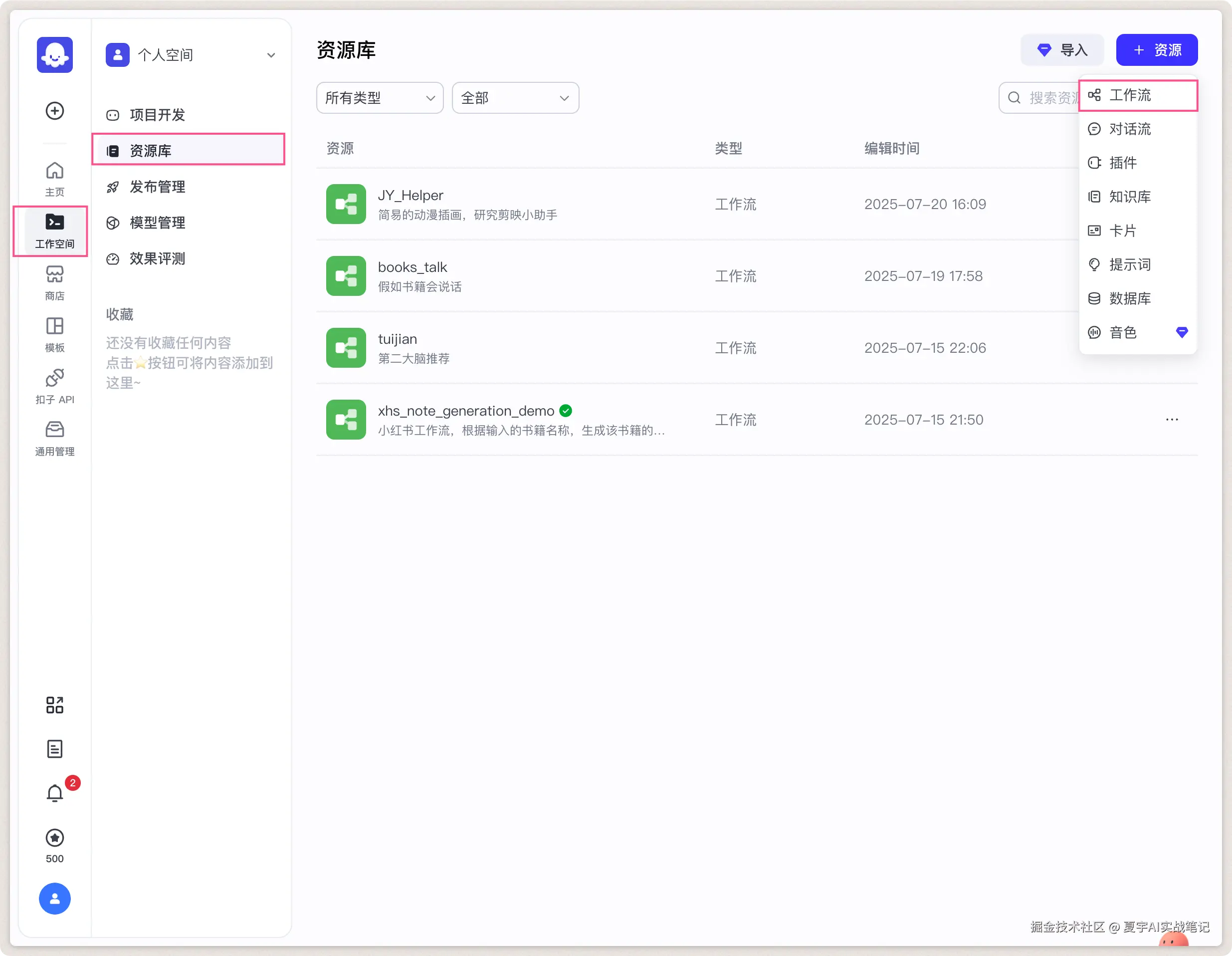 选择工作空间,在资源库右上角「资源」选择创建「工作流」