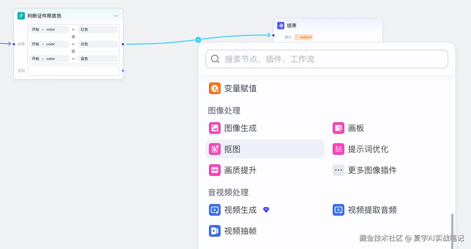 6. 在IF判断节点的「如果」后,添加节点,选择「抠图」