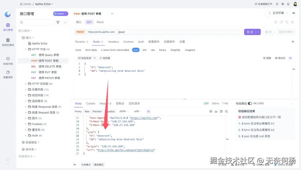 这个接口来源于apifox,如下,就是用来测试的,请求参数会赋值到响应json中,也正是如上的取值路径。