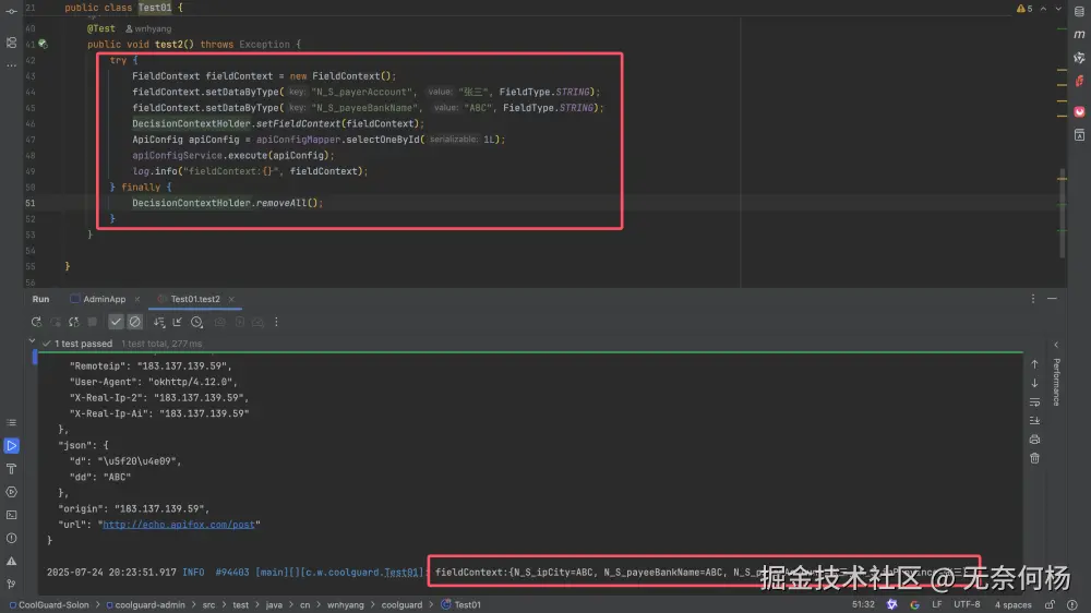 测试一下,如下,单元测试模拟系统运行的上下文,并运行api组件,查看日志即可看到请求成功且变量正确作为请求body并被正确赋值了。
