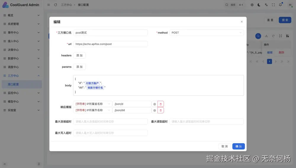 如下,这里配置了一个三方接口,body使用了变量编辑组件,在json模版中使用变量,在响应中使用Jackosn路径取值方法对变量赋值。