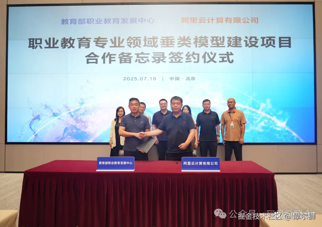 为落实《教育强国建设规划纲要(2024-2035年)》,加速职业教育与人工智能深度融合,推动大模型赋能职业教育专业建设,7月18日教育部职业教育发展中心与阿里云在京签署合作备忘录,共同推进职业教育专业领域垂类模型建设。教育部职业教育发展中心主任林宇和阿里云政企事业部副总裁杜胜海出席签约仪式。