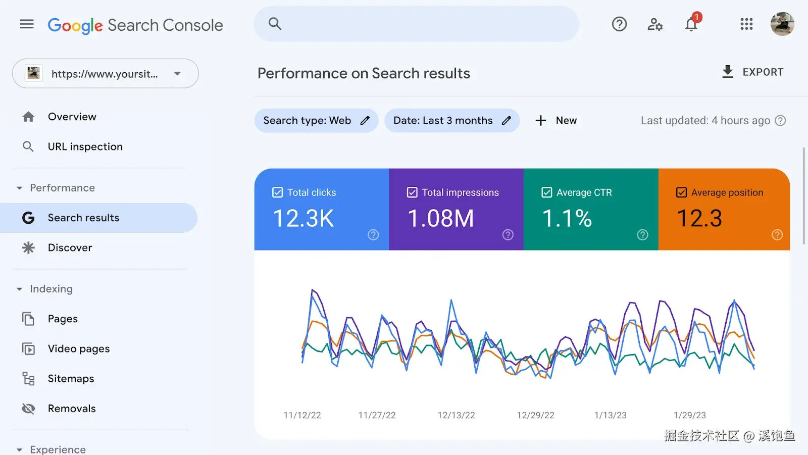 性能报告提供了我们网站在Google搜索中的表现数据。它显示了四个关键指标: