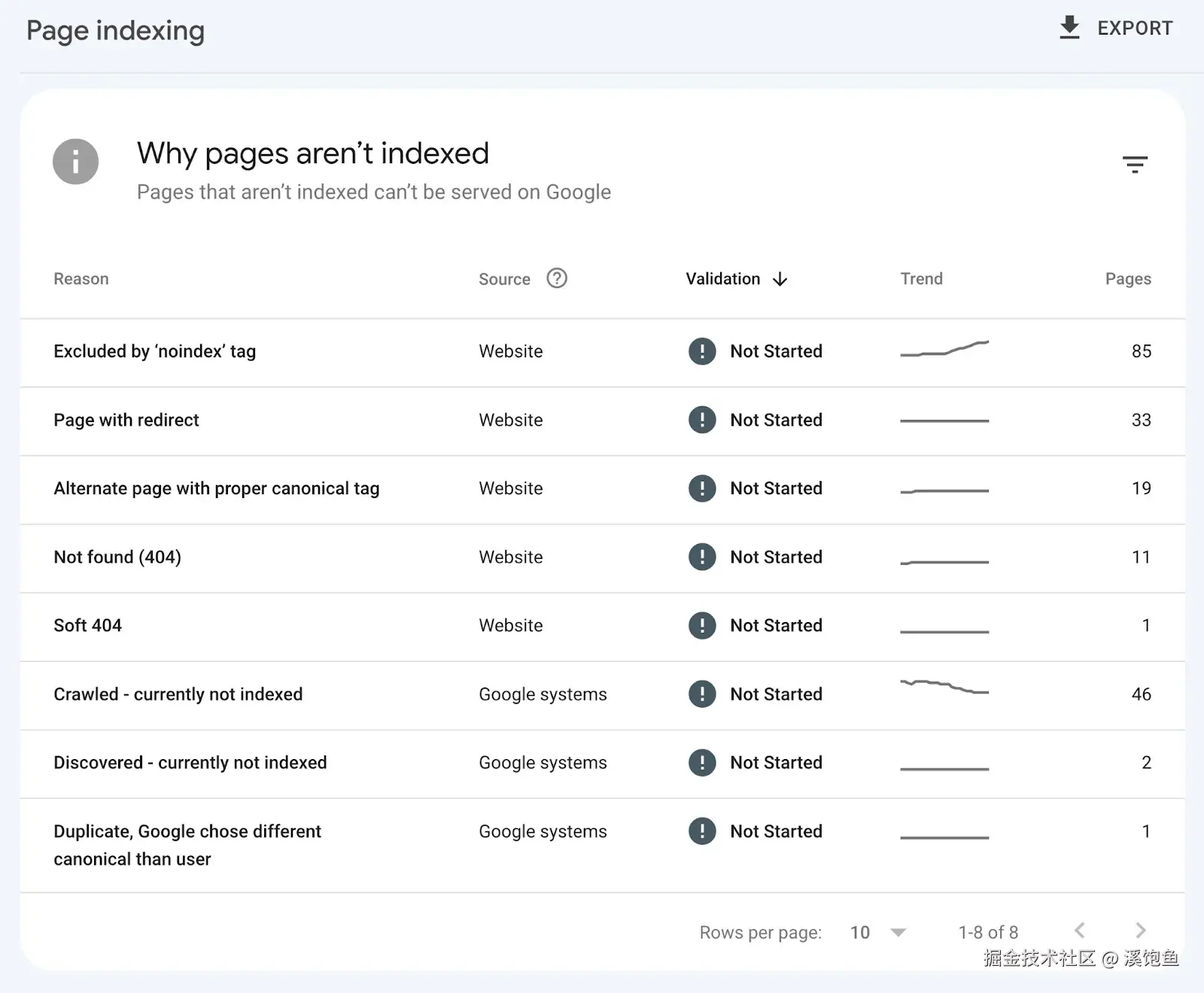 页面索引报告显示了Google可以找到和索引的页面,以及任何相关问题。它包括: