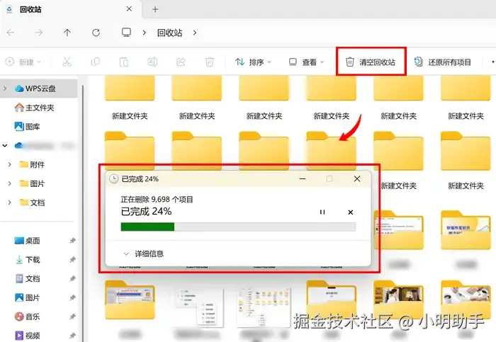 C盘怎么清理无用文件?我们可以稍微检查一下自己堆放的回收站文件,如果发现都是无用的文件,可以直接点击上方的【清空回收站】,让清空出更多的内部存储空间。