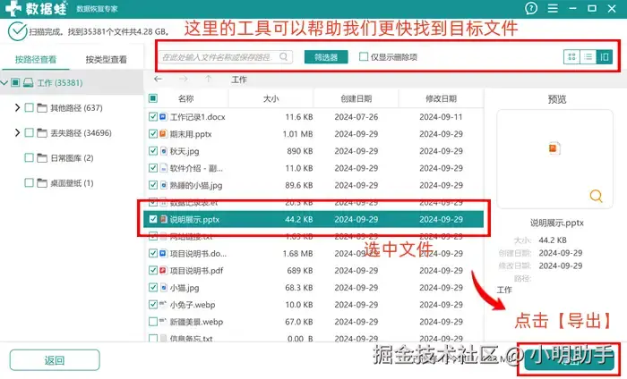 第2步: 在扫描完成后,用户就可以在里面尝试找到自己需要恢复的文件了;选中后点击【导出】,让文件恢复到其他位置去进行保存(在弹窗中选择目标位置)。