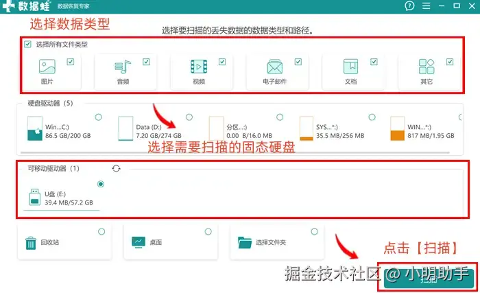 第1步: 打开软件首页,根据上方的提示完成扫描位置和扫描数据类型的选择,选好后开启软件的扫描功能;