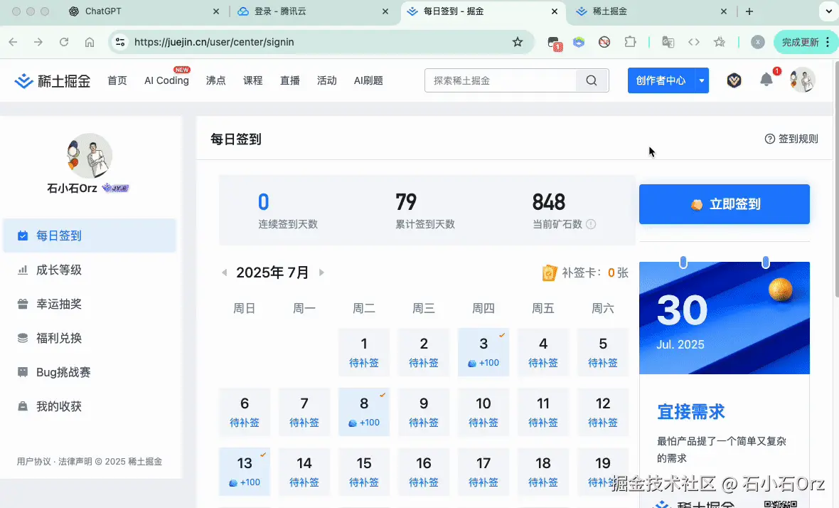 就是因为这几天持续的写作,居然连续忘了好几次掘金签到,难受!作为脚本开发者,这事儿不能忍,必须写一个掘金自动签到脚本干它!