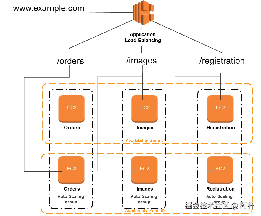 - 前面挂一个 ALB,接收所有 HTTP 流量,按路径转发请求