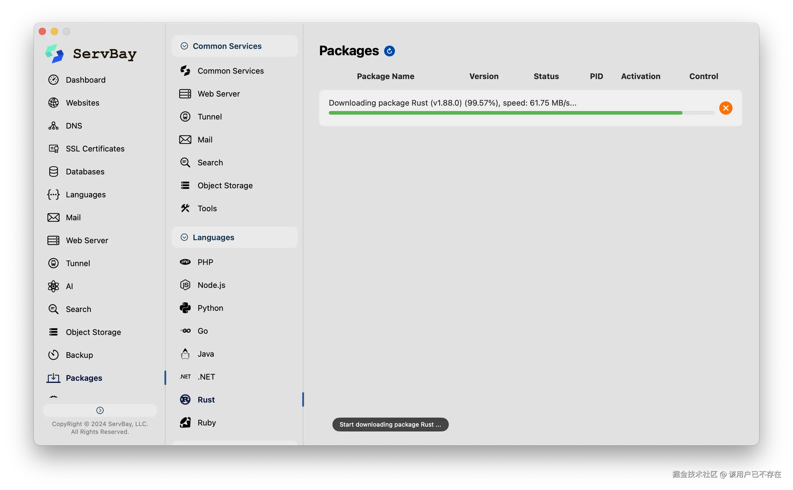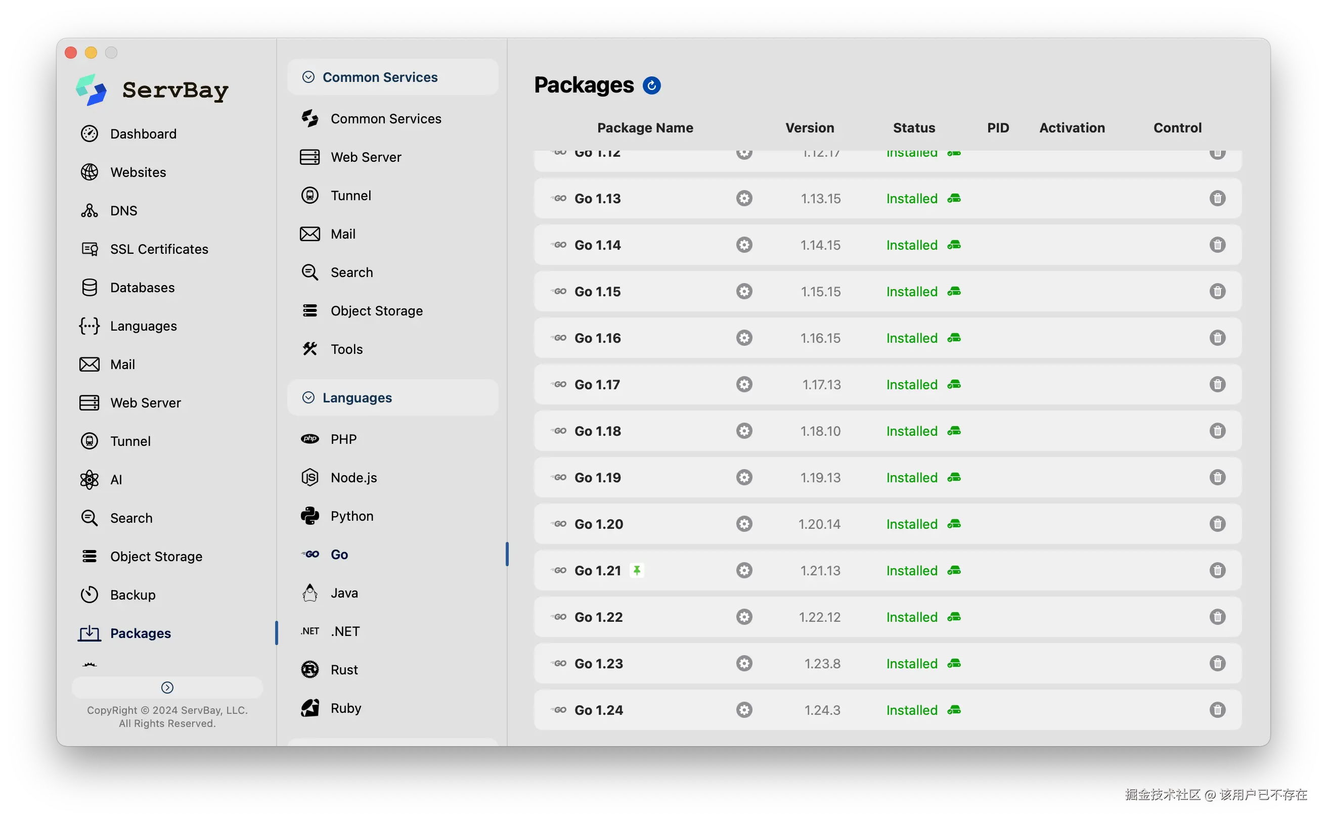 - 核心优势:简化部署。ServBay把配环境这种麻烦又琐碎的事情变得简单,只需要一键点击就行。想用哪个版本的 Go 或 Rust?在图形界面上点一下就行,完全不用跟复杂的命令行和配置文件死磕。它能给你一个干净、隔离又稳定的开发环境。