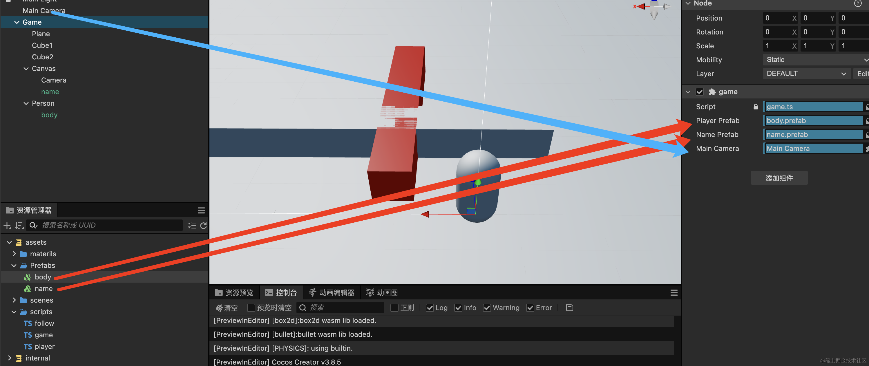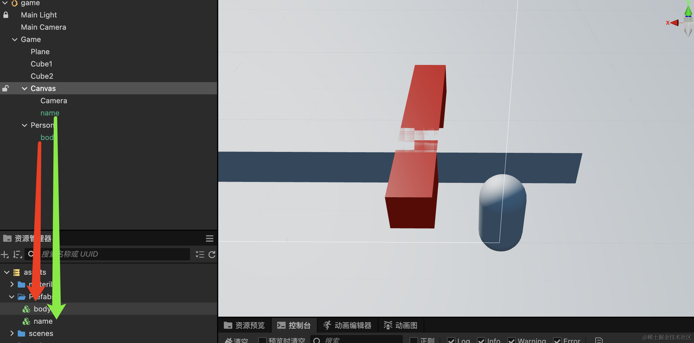 然后将玩家Body和name单独存储为预制体,再通过脚本来动态生成玩家对象和昵称对象,将玩家对象和昵称对象单独放在各自的节点下面,比如玩家放在Person这个节点下,昵称放在Canvas这个节点下。