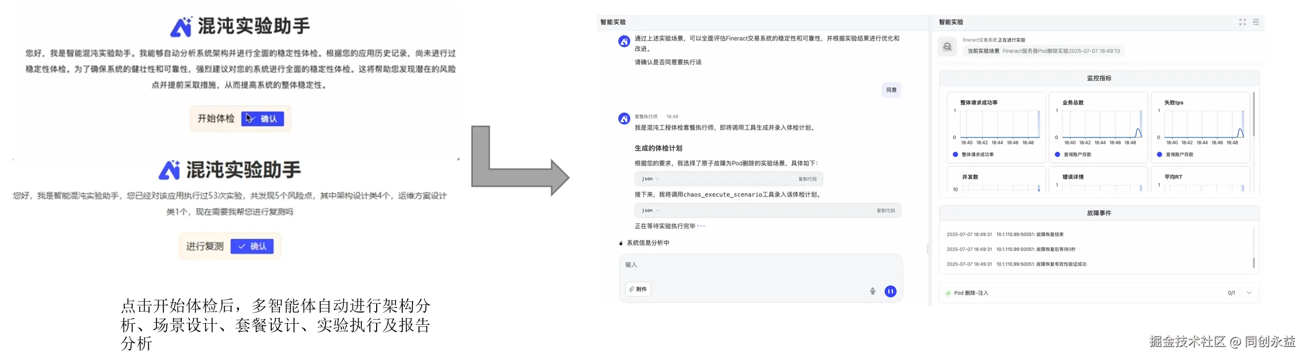 混沌工程智能实验工作台提供 “全流程、自动化” 混沌体检实验解决方案,用户选择应用后,系统内由架构分析师、场景设计师、套餐设计师和体检分析师多 智能体 协作处理,自动完成 “架构分析→场景生成→套餐执行→报告输出” 全流程,使单次体检耗时从 48 小时压缩至 3.5 小时,风险点发现率提升至 98% 。