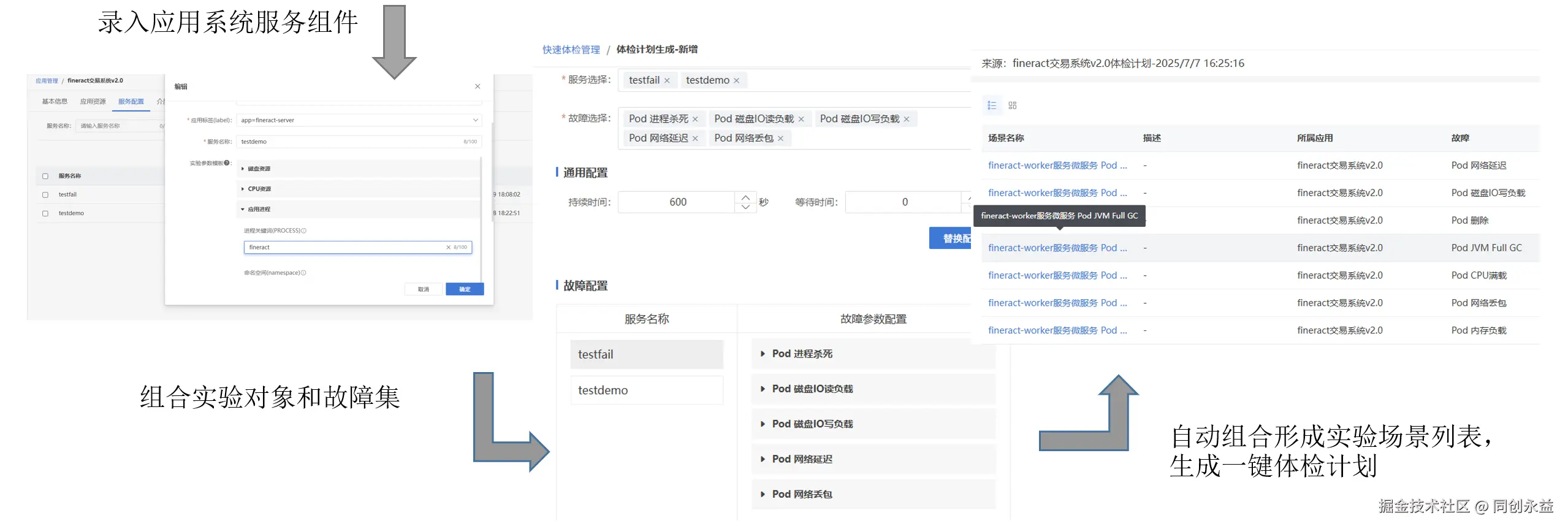 通过智能化的 全量体检套餐设计、应用系统复测场景设计、用户自定义体检套餐设计 等流程,结合实验指标监控与大模型智能分析,实现系统稳定性的持续验证、风险闭环管理与优化提升。