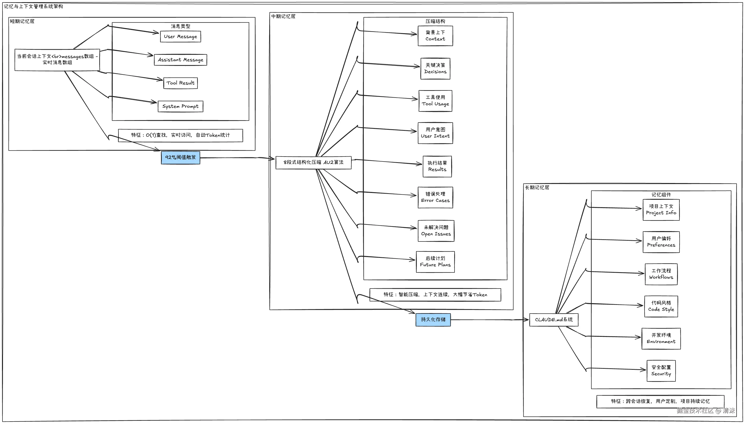 Claude Code 采用三层记忆架构,会从 背景上下文,关键决策,工具使用,用户意图,执行结果,错误处理,未解决问题,后续继续 等 8 个关键点进行压缩: