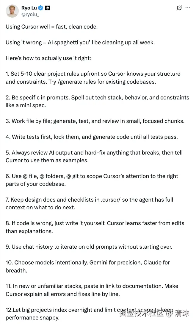 除此之外,在 Cursor 等文档中也提到了如何处理 Large Codebases,Cursor 的工程师也在 Twitter 上发表了 12 条 best practice