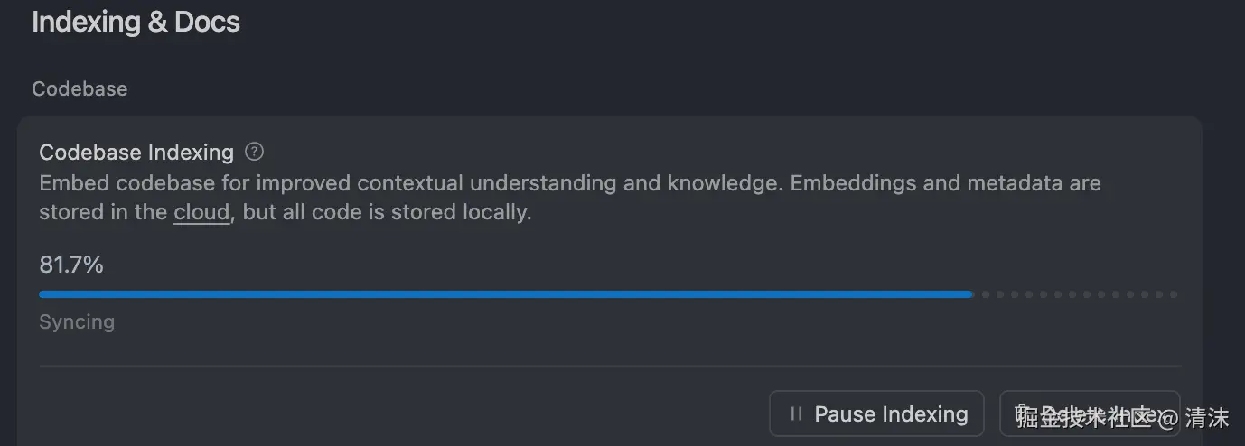 比如在 Cursor 中打开一个代码仓库后,后台会启动 Codebase Indexing 的工作流,将所有的代码建立索引: