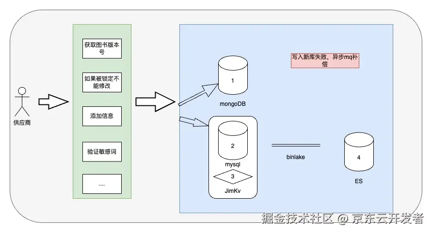 先写mongo再写mysql,以mongo写入成功为准,写mysql失败,mq异步补偿