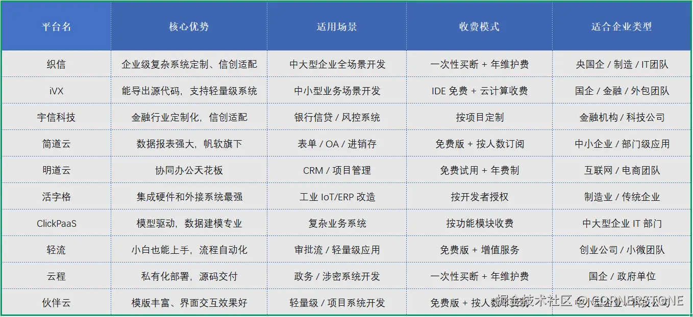 直接甩个对比表,后面再细说每个低代码平台的特点: