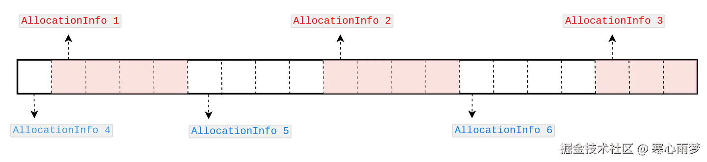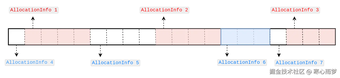 如果AllocationInfo是已申请的内存块且前面有空闲内存也就是GetPrevFreeBytes()不为0 则把这样的info通过FreeBlocks来进行管理(如上图中的1/2/3), 以便于内存申请时查找到合适的内存块.