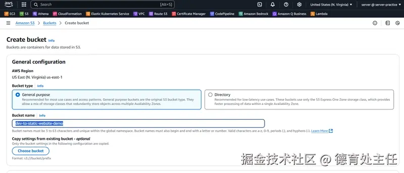my-static-website-加上你的名字和日期。 - 亚马逊云区域:选择一个离你或你的主要用户群体最近的区域。