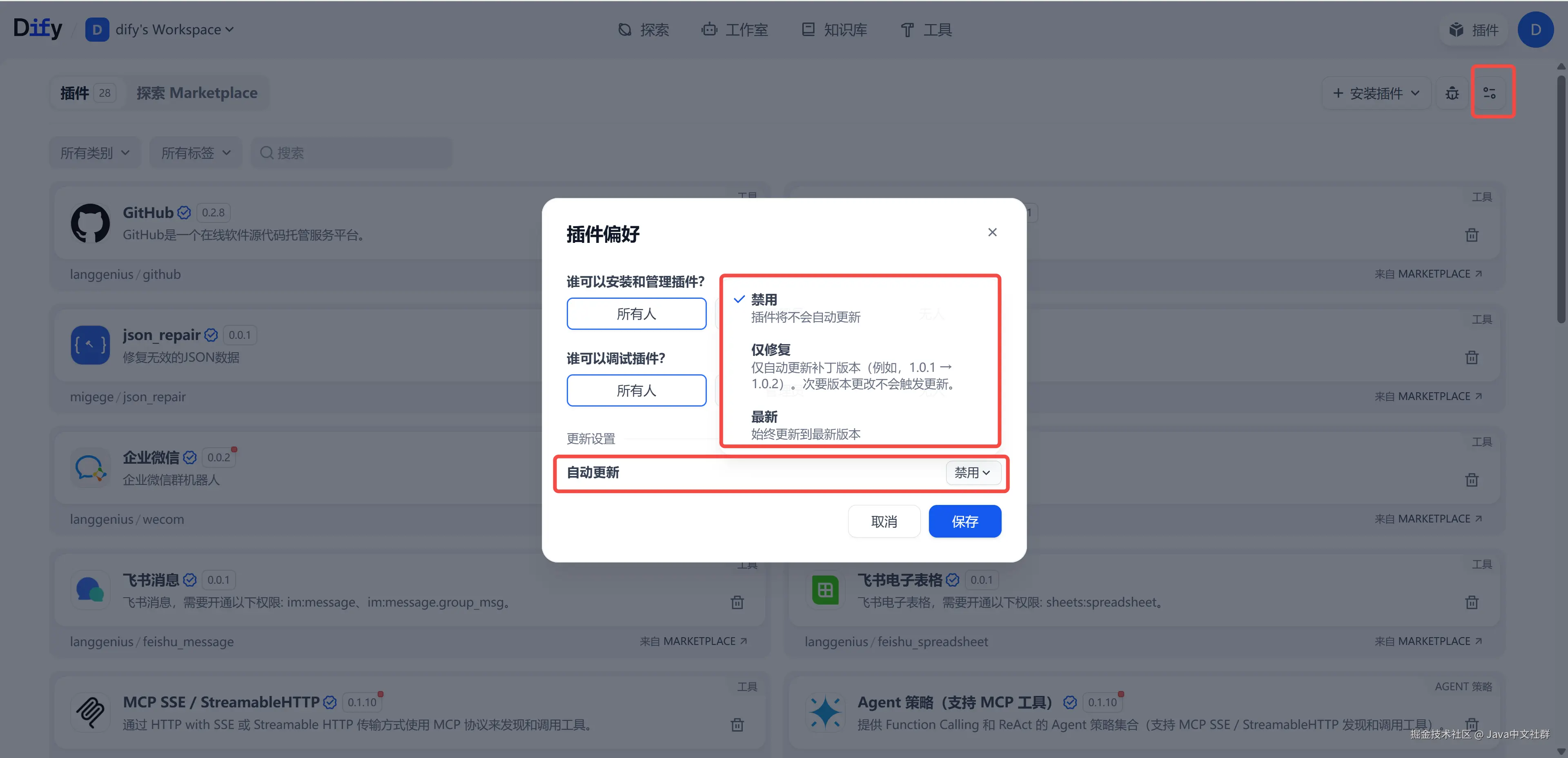 升级最新版的 Dify 之后,点击“插件”“偏好设置”就能看到插件的自动更新设置了: