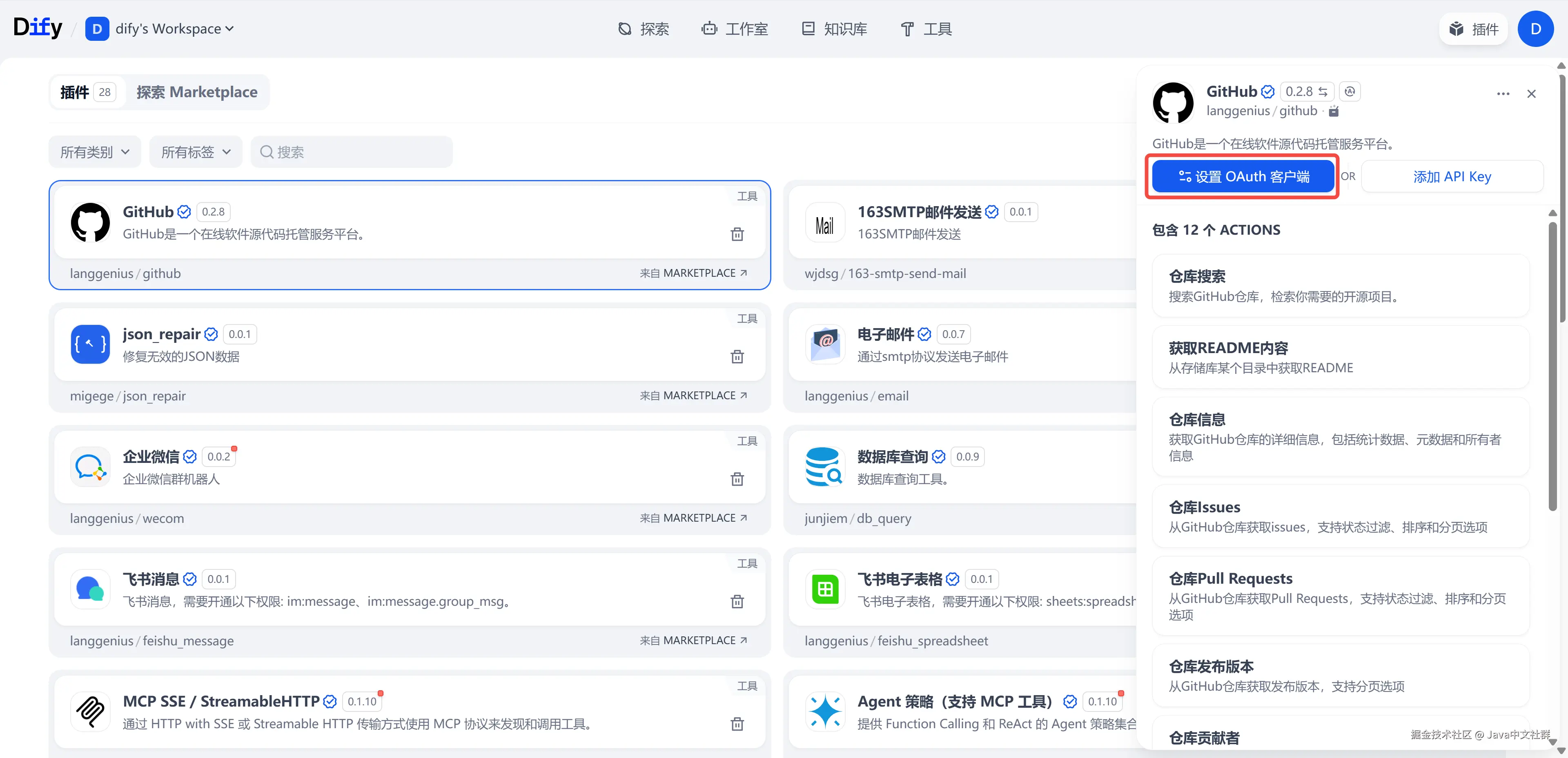 升级最新版的 Dify 之后,我们在插件中就可以使用 OAuth 授权方式了,如下图所示: