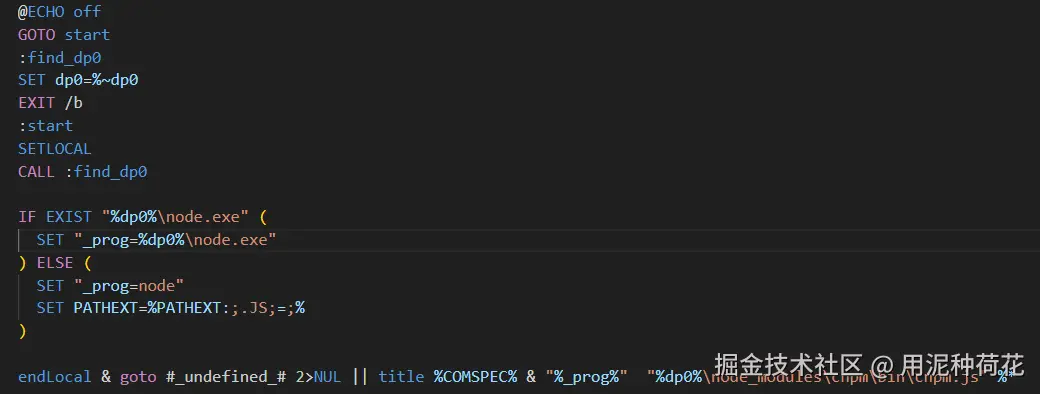 cnpm.cmd文件 :由于在Windows系统下,无法直接运行js文件,所以需要创建一个cmd文件,将node运行js文件的命令写入cmd文件中判断