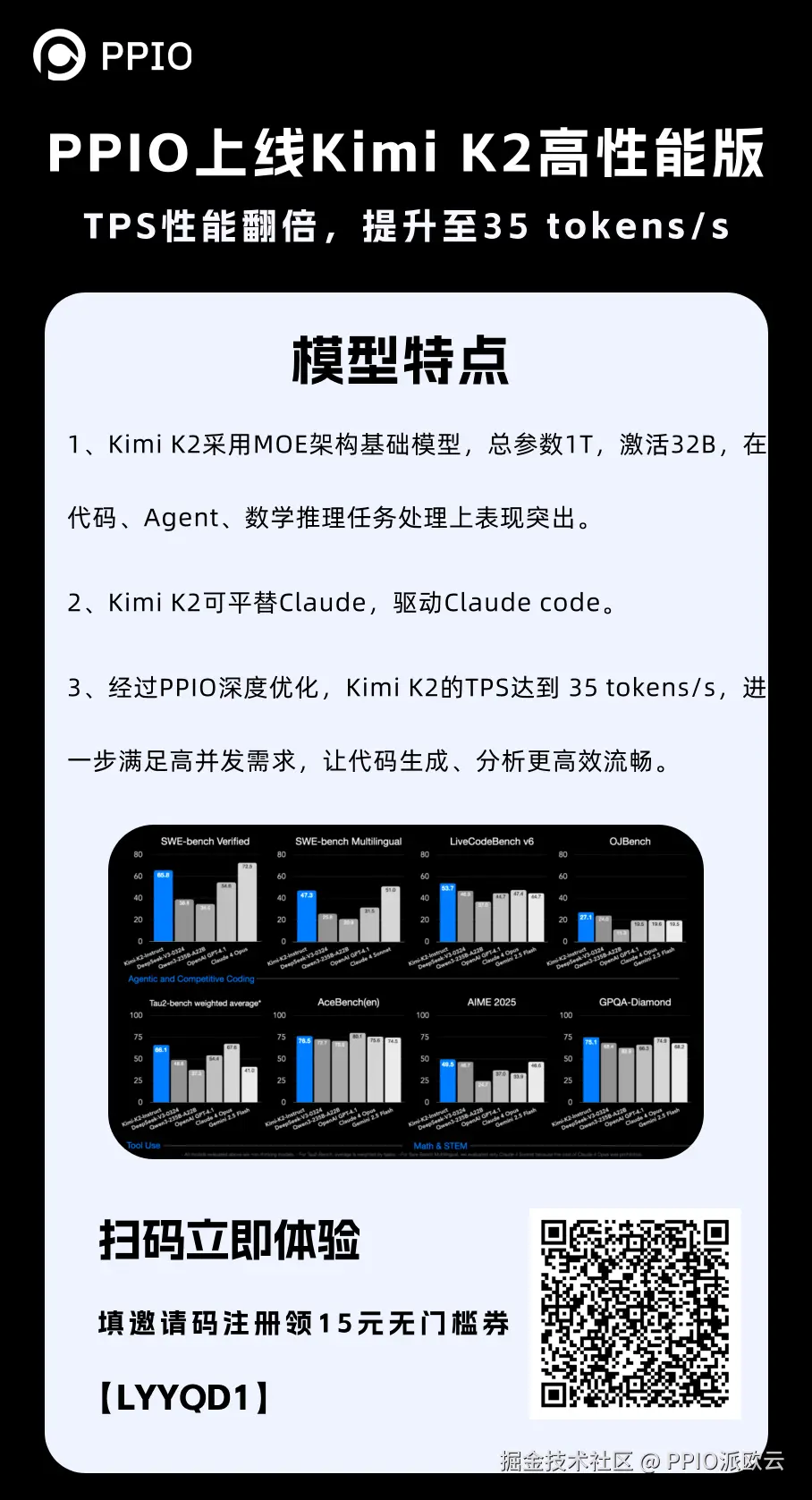 现在,点击阅读原文即可体验 35 tokens/s 的 Kimi K2 高性能版本。如果你是新用户,填写邀请码 【LYYQD1】 可得 15 元代金券】。